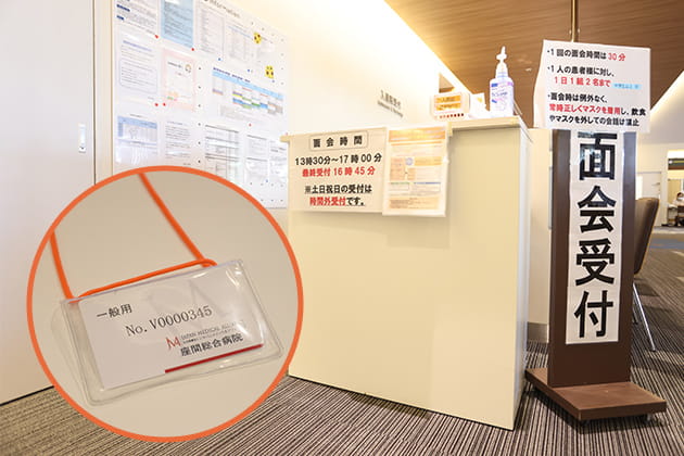 面会受付表を記載して面会受付へお持ちください。