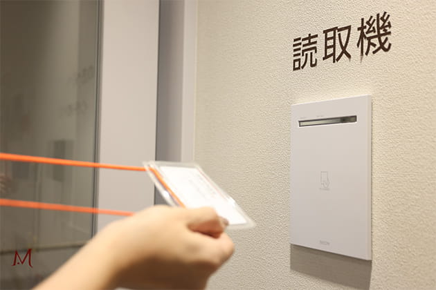 ガラス扉が開きましたら正面の廊下を進み、看板が見えたら左側の扉の左側にある読み取り機に入館証をかざします