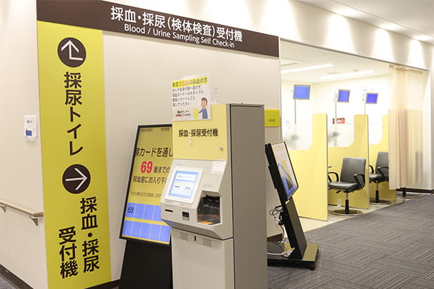採血・採尿の方は採血コーナーの受付機に診察券を入れ、検査番号札をお取りください。