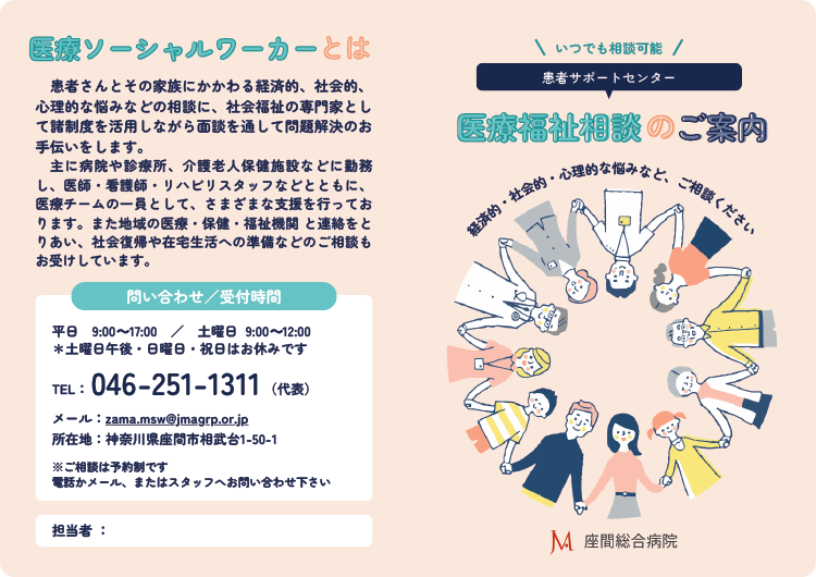 ※座間総合病院代表電話(上記番号)へお電話いただき、入退院調整看護師または医療ソーシャルワーカーへとお伝えください。