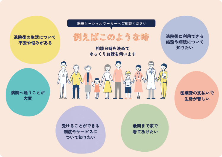 当院では医療ソーシャルワーカー・入退院調整看護師がご相談をお受けしております。